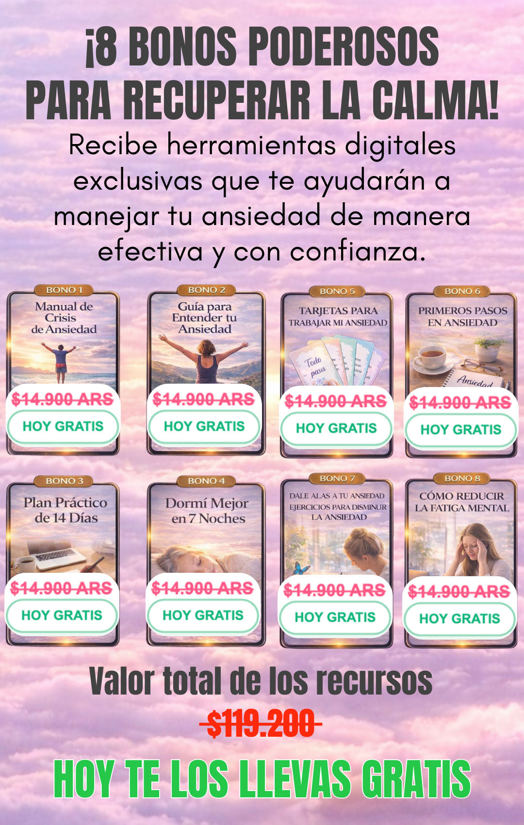 Vas a recibir 8 recursos digitales que te ayudarán a manejar tu ansiedad y volver a la calma de manera efectiva y con confianza.